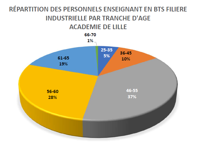 Les services RH des rectorats d’Amiens et de Lille ont fourni des données très intéressantes confirmant malheureusement les craintes de la FSU : dans l’académie d’Amiens, 37% des collègues de S2I ou de physique appliquée enseignant en BTS ont plus de 55 ans, et dans l’académie de Lille, 48% ont plus de 55 ans !