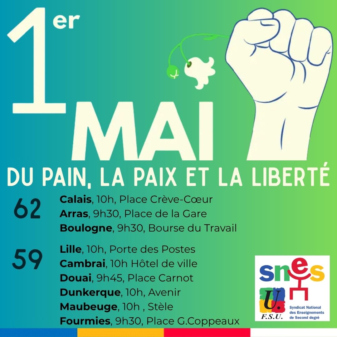 Vous êtes ici : Accueil Actualité Actions, affiches, tracts Les RDV du 1er mai dans le Nord et le Pas-de-Calais 20 avril 2026 Actualité Les RDV du 1er mai dans le Nord et le Pas-de-Calais Imprimer l'article Calais, 10h, Place Crève-Cœur Arras, 9h30, Place de la Gare Boulogne, 9h30, Bourse du Travail Lille , 10h, Porte des Postes Douai, 9h45, Place Carnot Dunkerque , 10h, Avenir Maubeuge , 10h , Stèle Fourmies , 9h30, Place G.Coppeaux 2026_04_15_1er_mai_intersyndicale_et_jeunesse.pdf